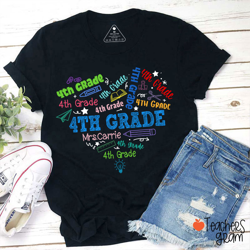 Personalized Grade And Name Heart Various Fonts Teacher T-Shirt