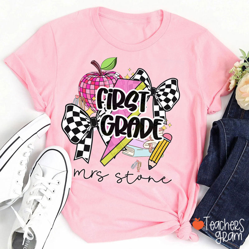 Personalized Grade And Name Checkered Apple Bow Lightning Teacher T-Shirt