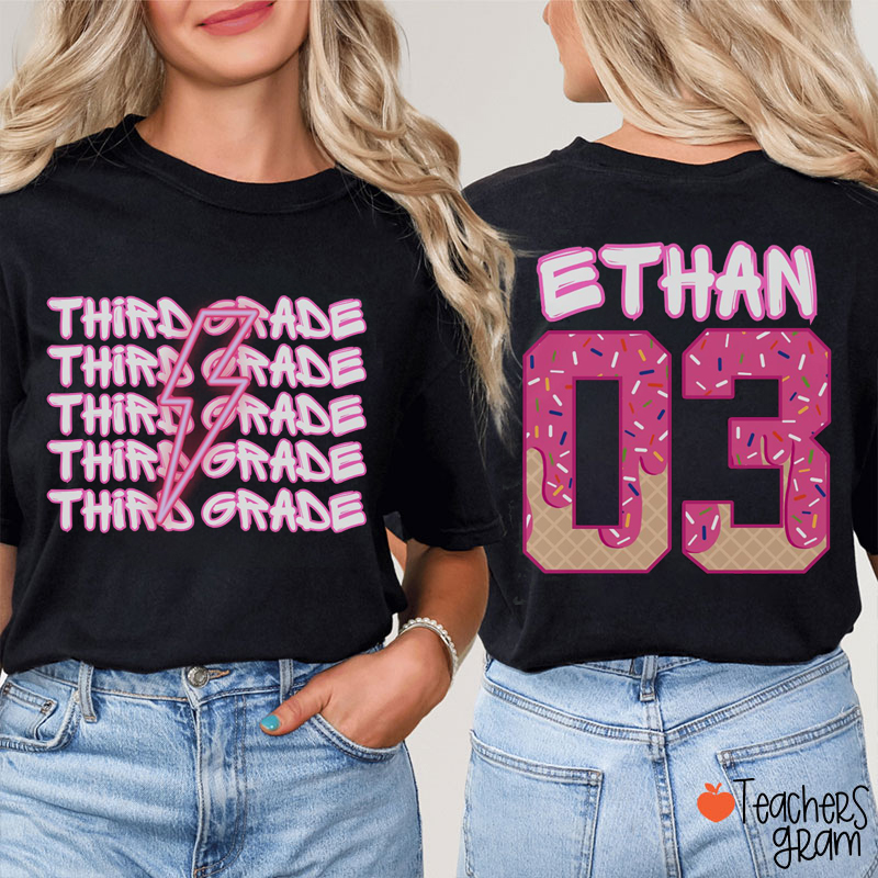 Personalized Name And Grade Donut Frosting Dripping Teacher Two Sided T-Shirt
