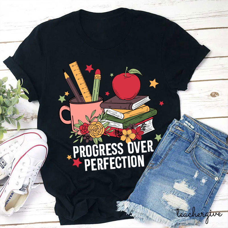 Progress Over Perfection Apple And Flower Teacher T-Shirt