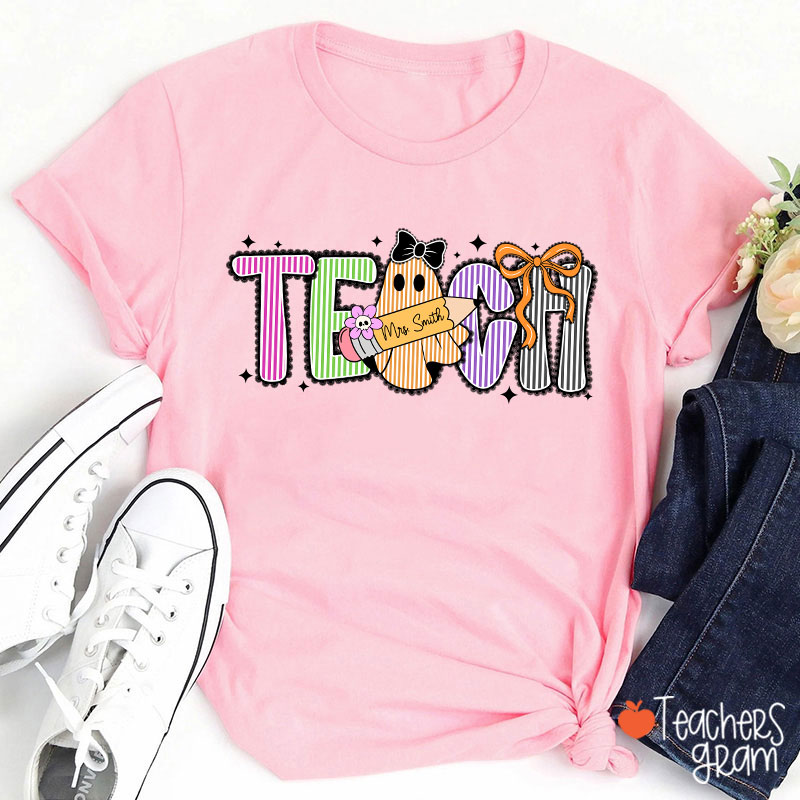 Personalized Name Preppy Teach Boo Ghost Coquette Teacher T-Shirt