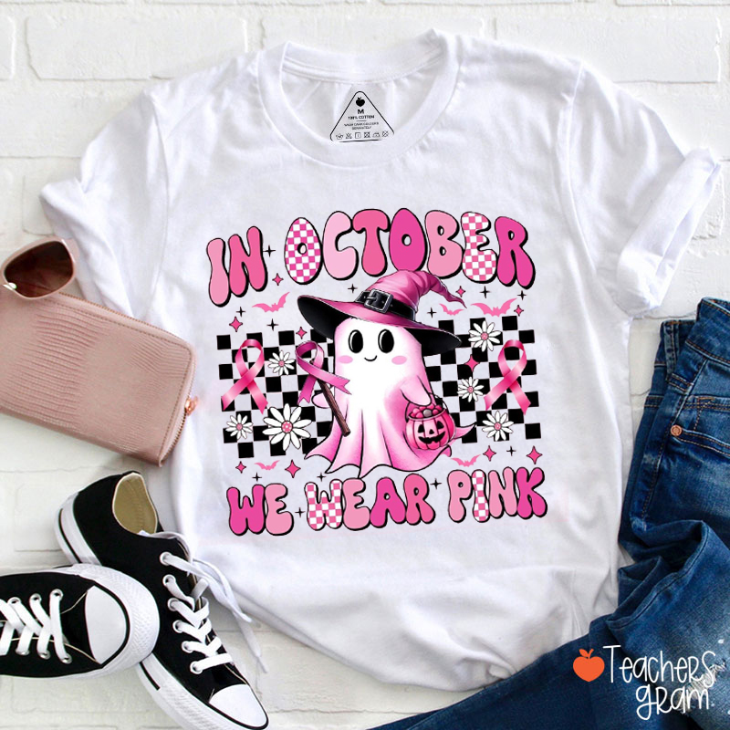 In October We Wear Pink Checkered Ghost Teacher T-Shirt
