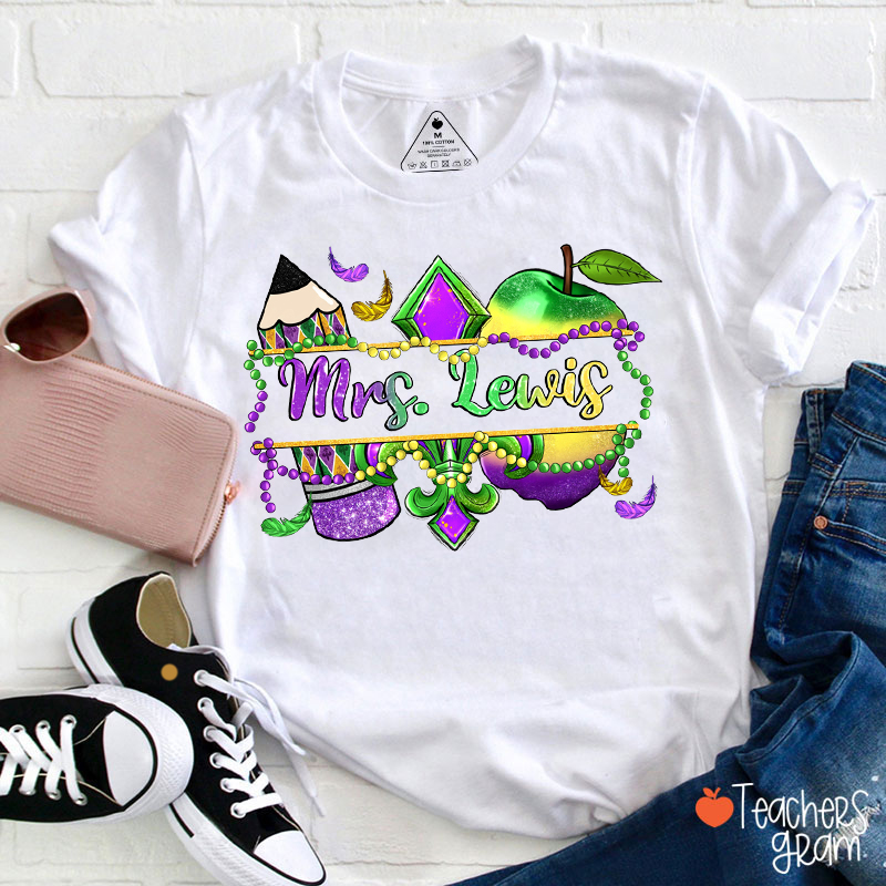 Personalized Name Apple Pencil Happy Mardi Gras Teacher T-Shirt