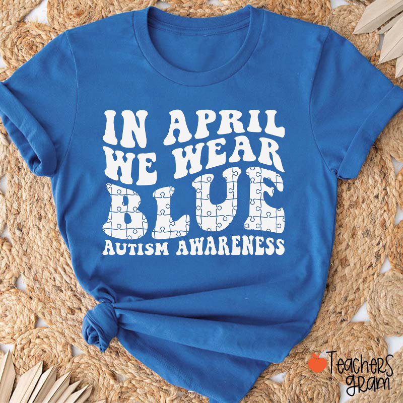 In April We Wear Blue Autism Awareness Puzzle Teacher T-Shirt