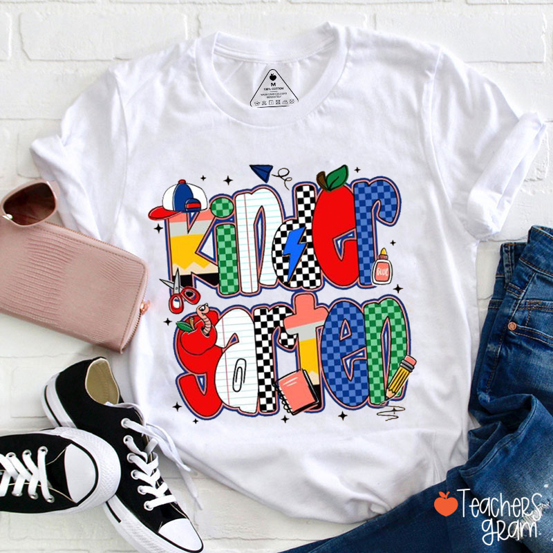 Personalized Grade Pencil Hat Checkered Font Teacher T-Shirt