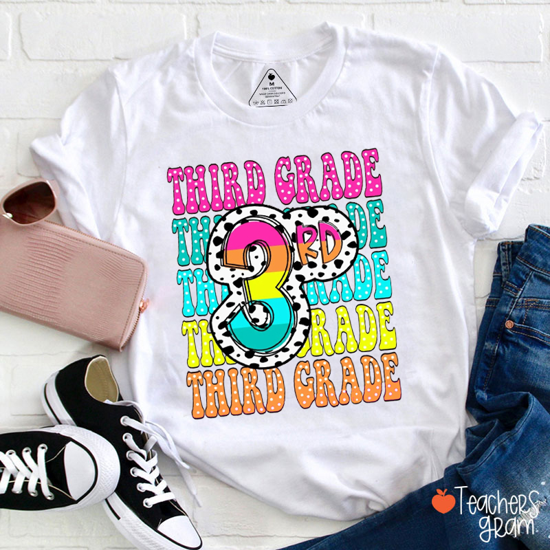 Personalized Grade Polka Dot Neon Font Teacher T-Shirt
