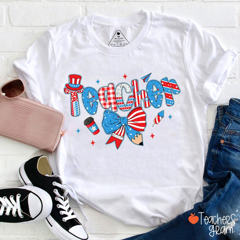 Personalized Text 4th Of July Red White And Blue Bow Teacher T-Shirt