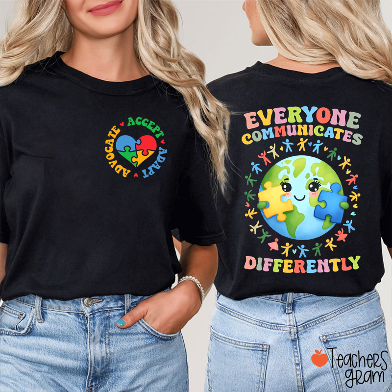 Everyone Communicates Differently Teacher Two Sided T-Shirt