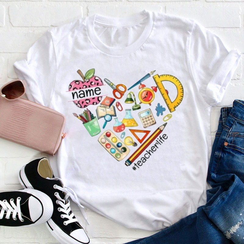 Personalized Teacher's Name School Name And Grade School Supplies Icon Teacher T-Shirt