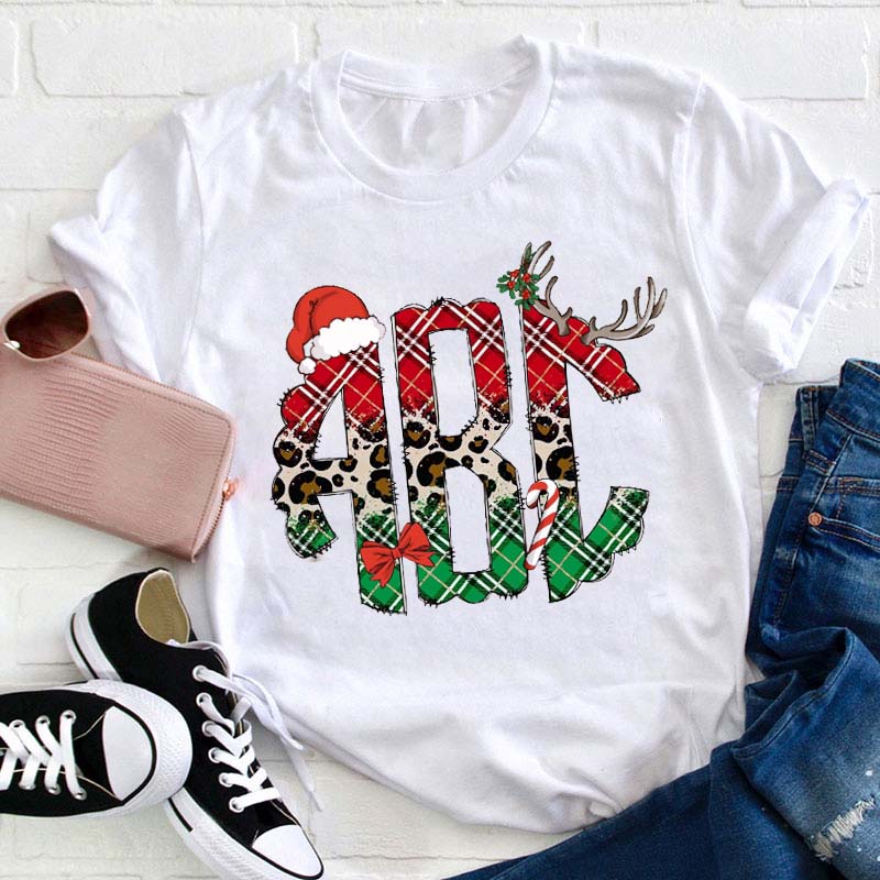 Personalized Christmas Leopard Monogram Letters Teacher T-Shirt
