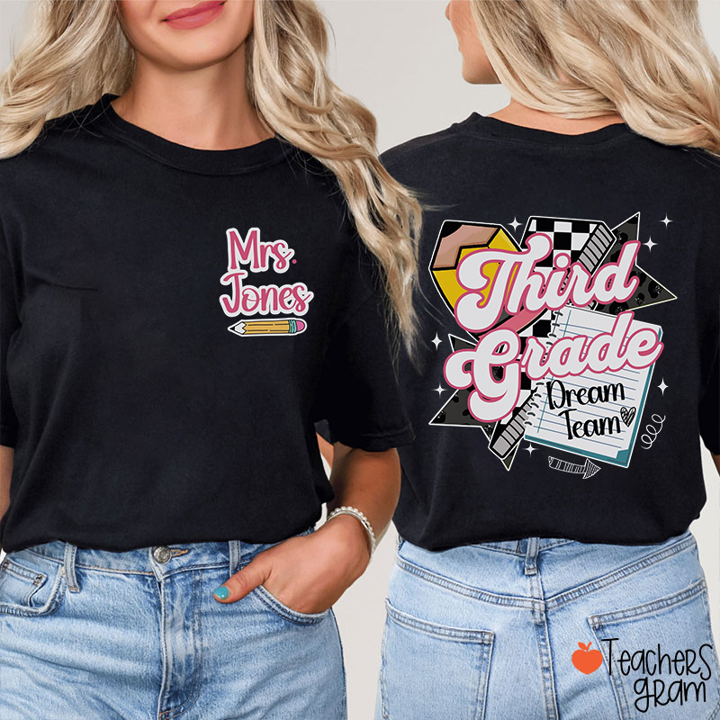Personalized Grade Name Pencil Notebook Lightning Checkerboard Star Teacher Two Sided T-Shirt
