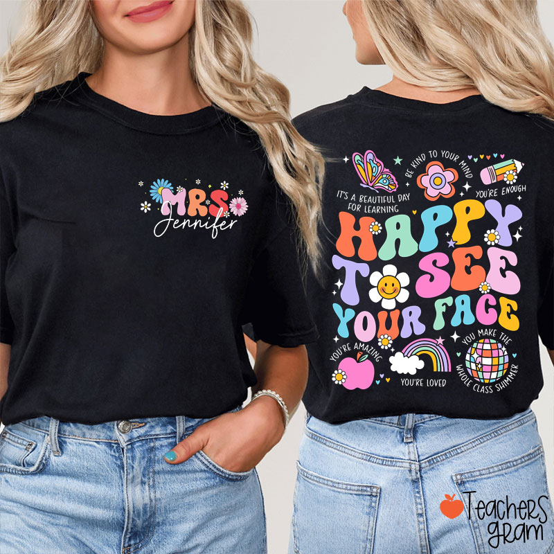 Personalized Name Happy To See Your Face Teacher Two Sided T-Shirt