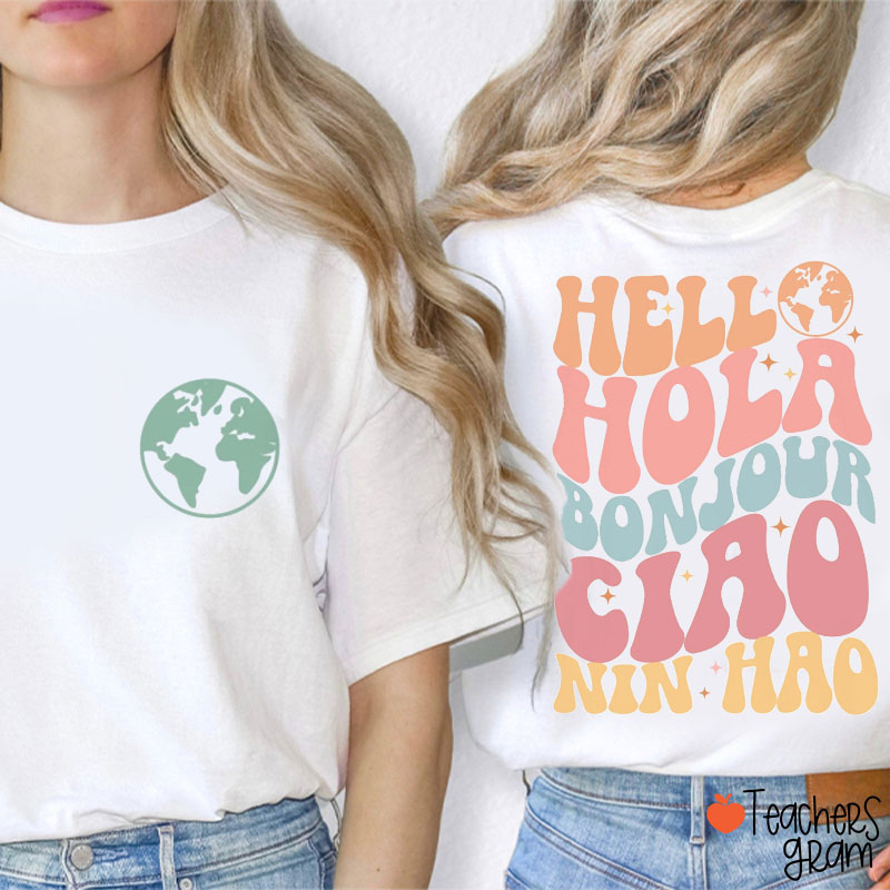 Hello Hola Bonjour Teacher Two Sided T-Shirt