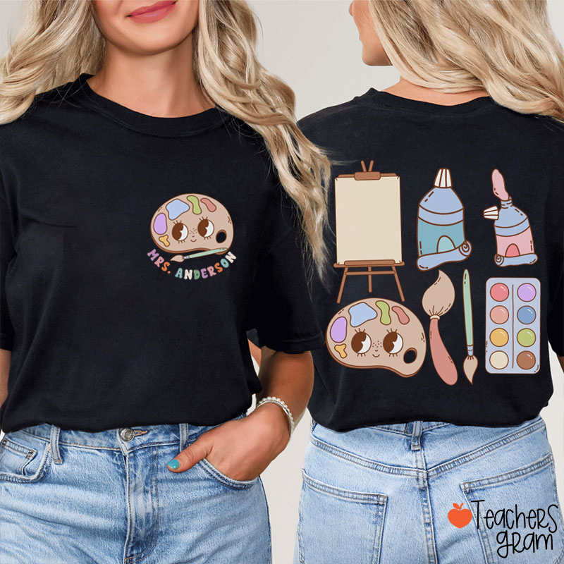 Personalized Name Retro Art Teacher Two Sided T-Shirt
