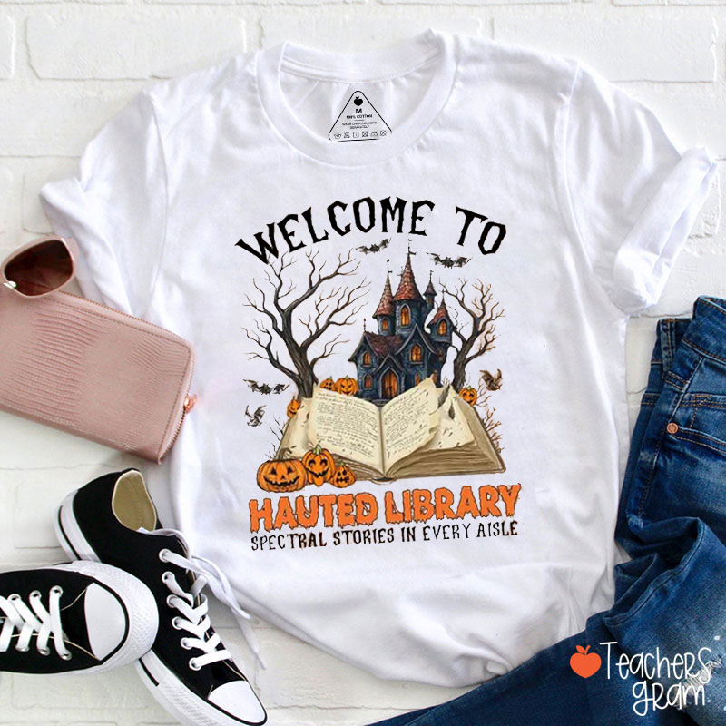 Welcome To Haunted Library Spectral Stories In Every Aisle Teacher T-Shirt
