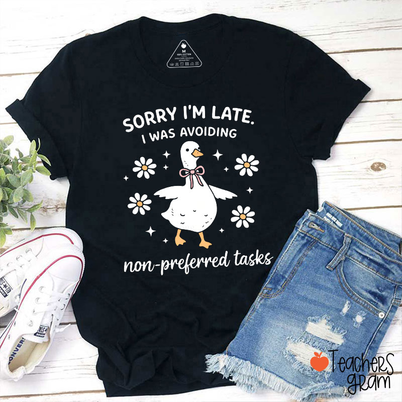 Silly Goose Sorry I'm Late I Was Avoiding Non-Preferred Tasks Teacher T-Shirt