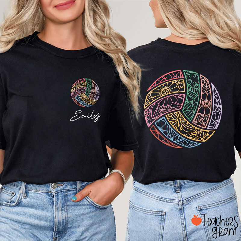 Personalized Name Floral Volleyball Game Day Teacher Two Sided T-Shirt