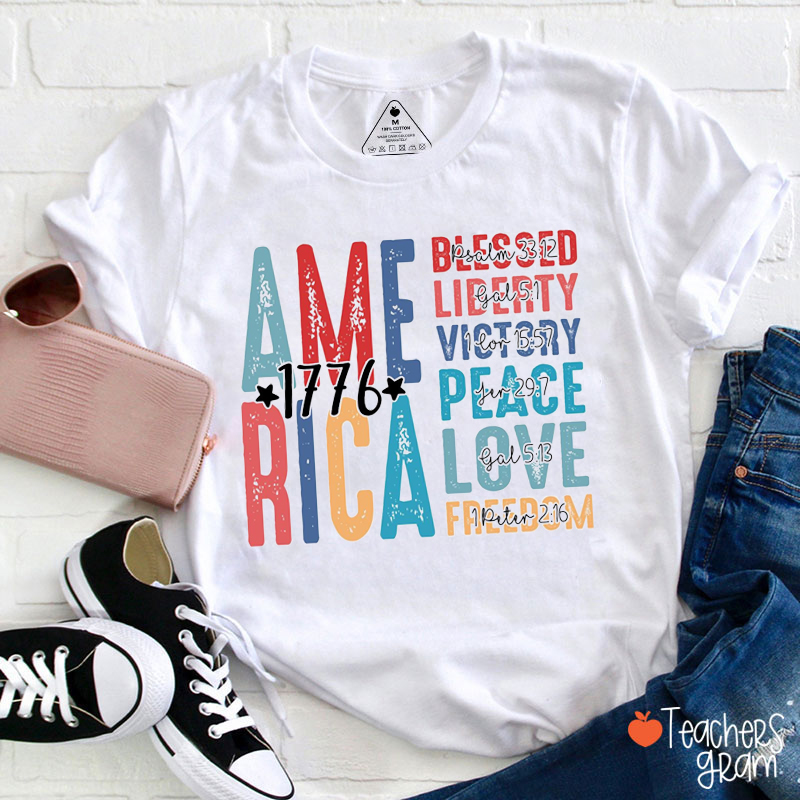 America Blessed Liberty Victory Peace Love Freedom Teacher T-Shirt