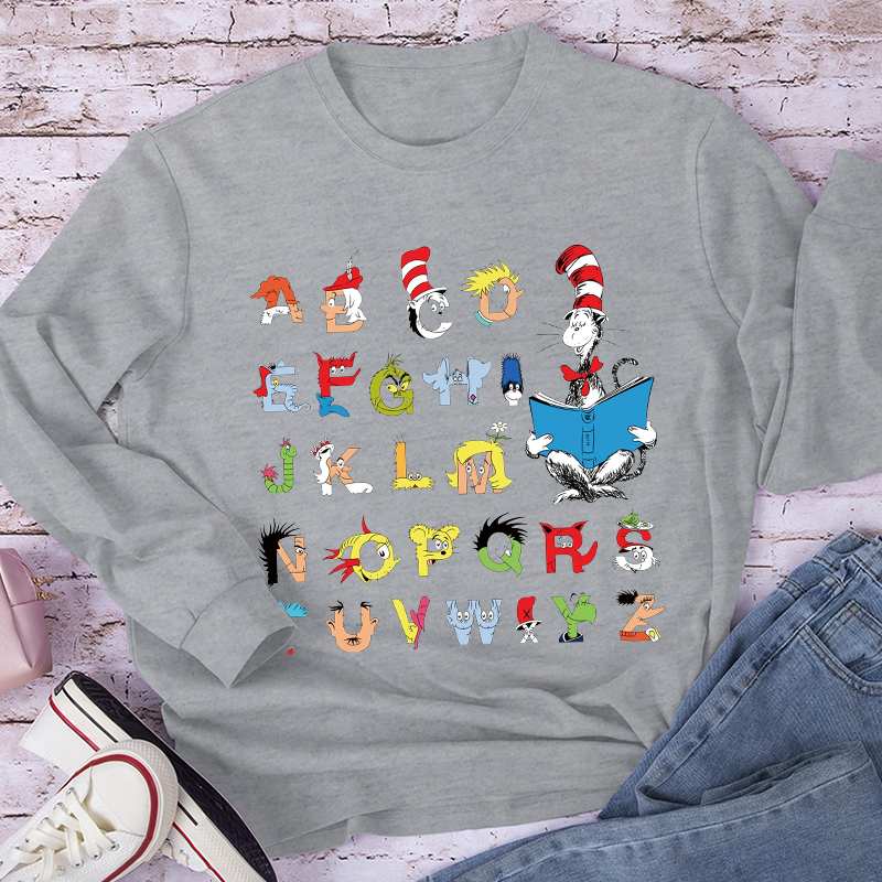 Cat Reading Books With Alphabet Teacher Long Sleeve T-Shirt
