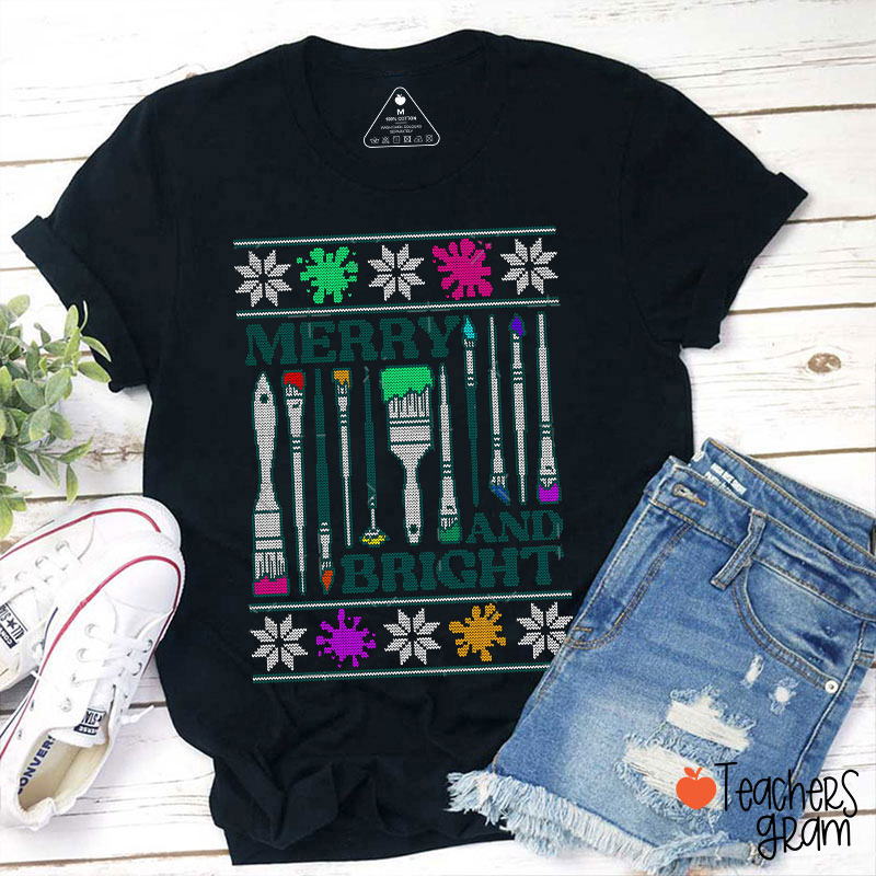 Merry And Bright Sweater Pattern Paint Brush Art Teacher T-Shirt