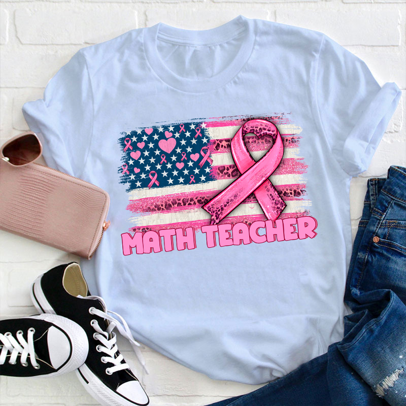 Personalized American Flag With Pink Ribbon Teacher T-Shirt