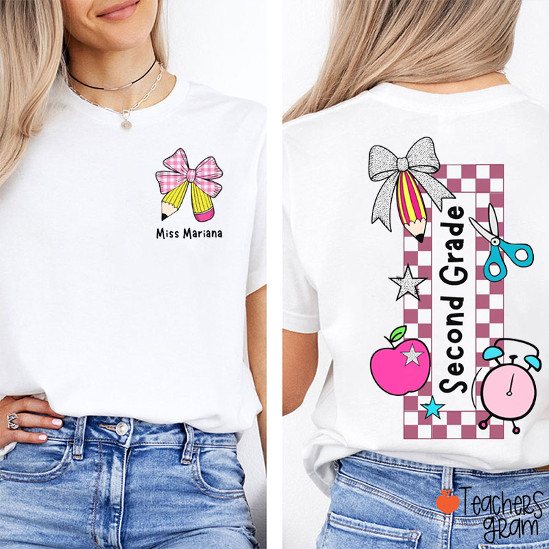 Personalized Grade And Name Checkered Pencil Bow Teacher Two Sided T-Shirt