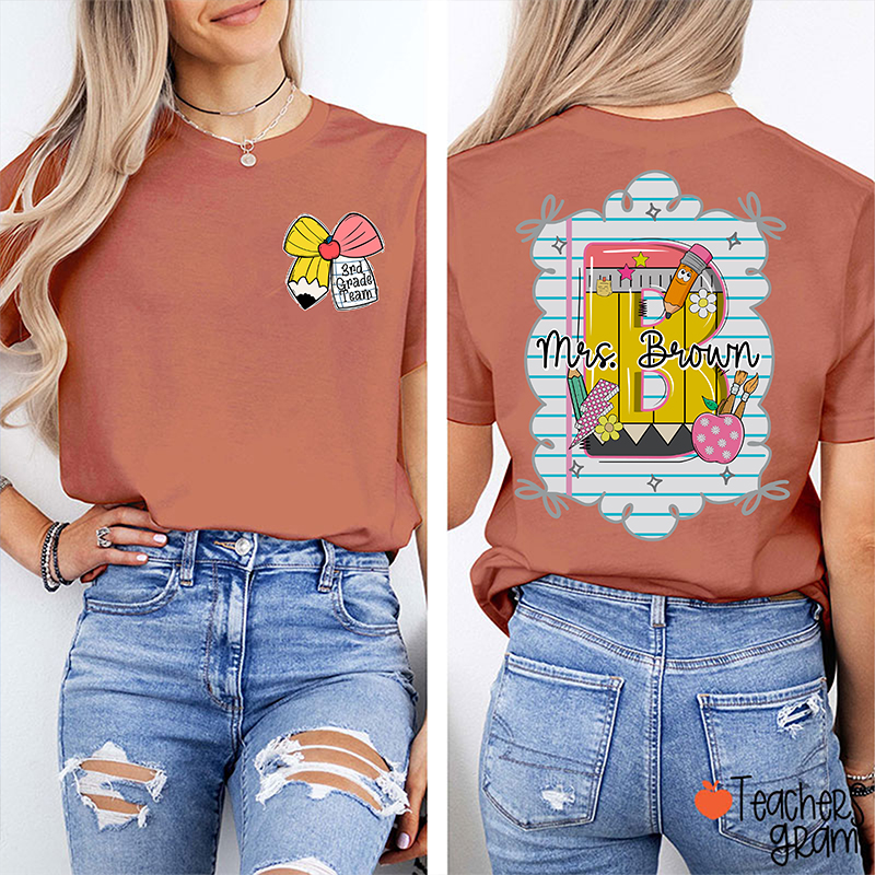 Personalized Grade And Name Pencil Bow Initials Teacher Two Sided T-Shirt