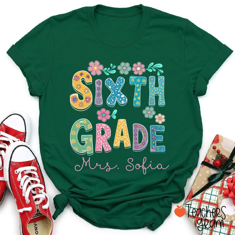 Personalized Name And Grade Flowers Fonts Teacher T-Shirt