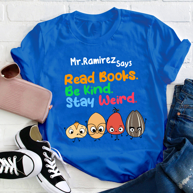 Personalized Name Read Books Be Kind Stay Weird Teacher T-Shirt