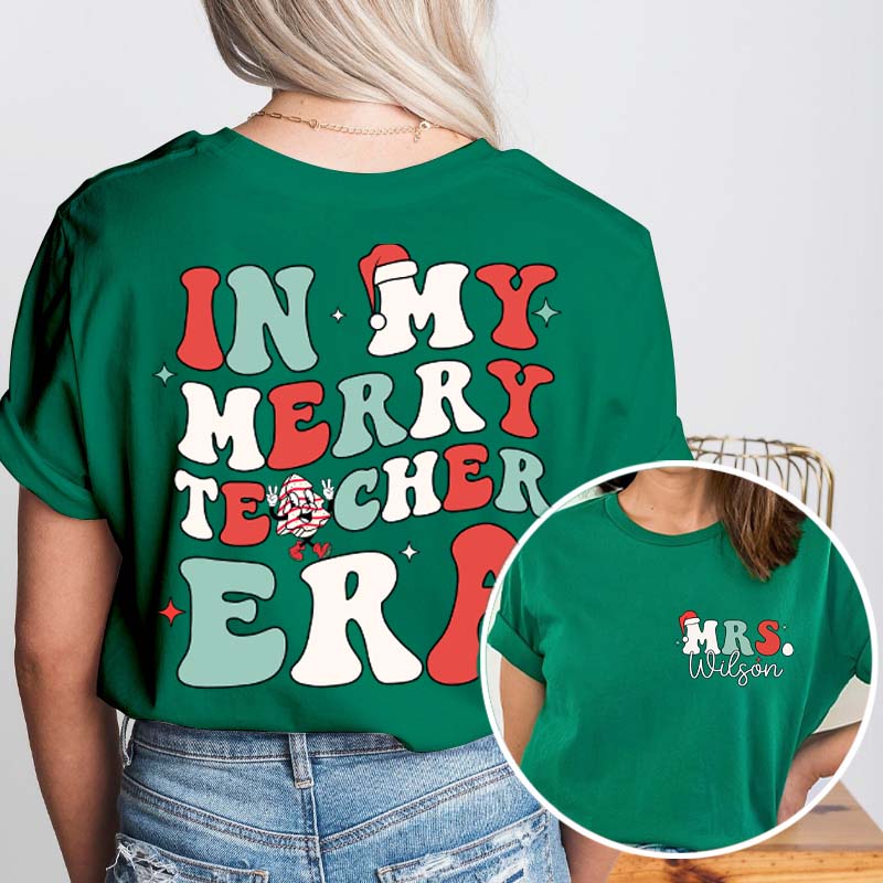 Personalized Name In My Merry Teacher Era Teacher Two Sided T-Shirt
