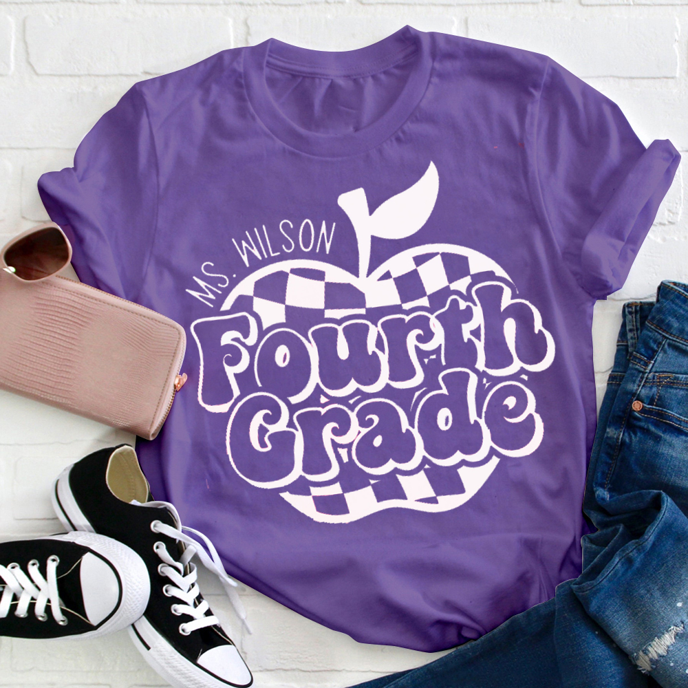 Personalized Teacher's Name And Grade Plaid Apple Icon Teacher T-Shirt