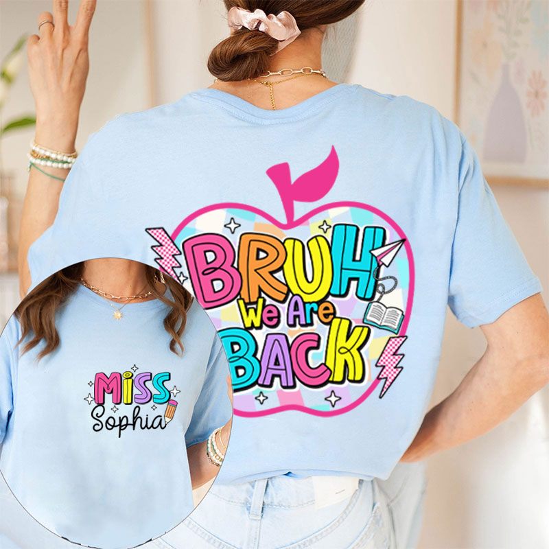 Personalized Teacher's Name Art Teacher Black And White Checkered Apple Design Teacher Two Sided T-Shirt